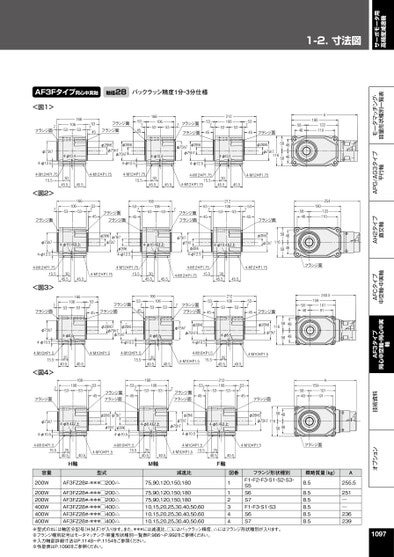 1-2.寸法図サーボモータ用高精度減速機オプション技術資料AF3タイプ同心中空軸・同心中実軸AFCタイプ中空軸・中実軸AH2タイプ直交軸APG/AG3タイプ平行軸モータマッチング・容量形状種別一覧表AF3Fタイプ同心中実軸軸径28バックラッシ精度1分・3分仕様<図1>7フランジ面106166535375345フランジ面フランジ面537451661065353フランジ面7537フランジ面45212106535353745フランジ面A1801221105846φ75h74-φ12.54-M12×P1.7515.5<図2>4-φ10.43045.545.510616653753φ28h6φ28h6φ75h7φ75h74-φ10.4φ75h7φ28h6φ75h74-φ12.54-φ12.54-φ10.4φ28h6φ75h7116584646584-M12×P1.754-M12×P1.7515.57534553745フランジ面フランジ面3045.545.54-M12×P1.7515.54-M12×P1.753045.545.54-M12×P1.7516610653537フランジ面フランジ面53745212106535353745フランジ面φ75h74-φ12.54-M12×P1.7515.5<図3>7フランジ面φ75h74-φ10.54-M10×P1.515.5<図4>フランジ面φ75h74-φ10.54-M10×P1.54-φ10.4以上φ28h6φ75h7φ75h7φ28h64-φ12.54-M12×P1.7515.53045.545.54-M12×P1.7516610653534-φ8.653745フランジ面フランジ面53745φ28h6φ75h7φ28h6φ75h74-φ10.52540.540.54-M10×P1.54-M10×P1.515.51061665375353745フランジ面フランジ面753454-φ10.4以上3045.545.516610653534-φ8.62540.540.516653106534-φ8.4以上φ28h6φ75h7φ75h7φ28h64-φ10.54-M10×P1.54-φ8.4以上15.52540.540.54-M10×P1.515.52540.540.5H軸M軸φ75h7φ75h7φ28h64-φ12.54-M12×P1.7515.54-M12×P1.757フランジ面フランジ面537454-φ10.4以上3045.545.52121065353φ28h6φ75h7φ75h74-φ10.54-M10×P1.54-M10×P1.515.54-φ8.62540.521210653534-φ8.4以上2540.540.5F軸7フランジ面フランジ面53745φ28h6φ75h7φ75h74-φ10.54-M10×P1.54-M10×P1.515.51802541221105846フランジ面φ28h6φ75h7116584646584-M12×P1.75フランジ面159240.5101915848159A10191584853745フランジ面φ28h65848116φ75h748584-M10×P1.540.553745フランジ面φ28h6φ75h7116584848584-M10×P1.5フランジ面容量200W200W200W400W400W400W型式減速比図番フランジ形状種別概略質量(kg)AAF3FZ28#-***□200△75,90,120,150,180AF3FZ28#-***□200△AF3FZ28#-***□200△AF3FZ28#-***□400△AF3FZ28#-***□400△AF3FZ28#-***□400△75,90,120,150,18075,90,120,150,18010,15,20,25,30,40,50,6010,15,20,25,30,40,50,6010,15,20,25,30,40,50,60112344F1・F2・F3・S1・S2・S3・S5S6S7F1・F3・S1・S3S6S78.58.58.58.58.58.5255.5251――236239※型式の#には軸区分記号(H,M,F)が入ります。また、***には減速比、□にはバックラッシ精度、△にはフランジ形状種別が入ります。※フランジ種別記号はモータマッチング・容量形状種別一覧表P.986~P.992をご参照ください。※入力軸部詳細寸法はP.1148~P.1154をご参照ください。※性能表はP.1090をご参照ください。1097