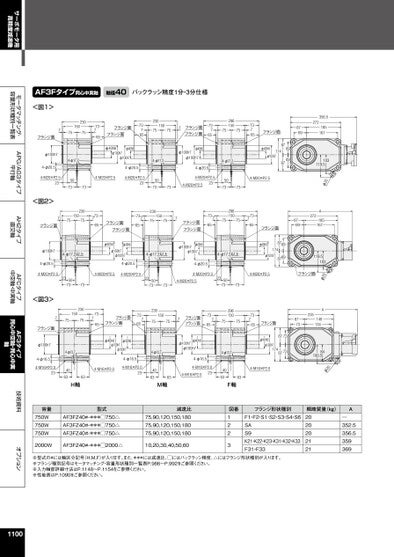 サーボモータ用高精度減速機モータマッチング・容量形状種別一覧表APG/AG3タイプ平行軸AH2タイプ直交軸AFCタイプ中空軸・中実軸AF3タイプ同心中空軸・同心中実軸技術資料オプションAF3Fタイプ同心中実軸軸径40バックラッシ精度1分・3分仕様<図1>1502307577573765フランジ面フランジ面73765フランジ面23075150757フランジ面フランジ面73765296150757573765フランジ面8769φ100h74-φ20.54-M20×P2.5234-φ17.2507373φ40h6φ100h7φ40h6φ100h74-M20×P2.54-φ20.54-M20×P2.5234-φ17.2507373φ100h7φ100h74-φ20.54-M20×P2.54-M20×P2.5234-φ17.2507373φ40h6φ40h6174φ100h7876969874-M20×P2.5272356.5185167103119.5φ20<図2>775フランジ面150230757376573765フランジ面フランジ面23075150757フランジ面フランジ面73765296150757573765φ40h6φ40h6φ100h7φ100h74-φ20.54-M20×P2.54-M20×P2.54-φ17.2以上23507373φ40h6φ100h7φ100h74-φ20.54-M20×P2.54-M20×P2.54-φ17.2以上23507373272A1851678769フランジ面φ40h68769174φ100h76987119.51034-M20×P2.5フランジ面φ20φ100h74-φ20.54-M20×P2.54-φ17.2以上23507373<図3>15023075775フランジ面φ100h74-φ16.54-M16×P2.0234-φ13.7406363H軸77365フランジ面フランジ面7365723075150775フランジ面フランジ面73657296150757573765フランジ面235A1481348773φ40h6φ100h7φ40h6φ100h74-M16×P2.04-φ16.54-M16×P2.023φ40h6φ100h7φ100h74-φ16.54-M16×P2.0234-M16×P2.04-φ13.7406363M軸φ40h6φ100h71744-φ13.7406363F軸4-M16×P2.08773738784100.5φ20容量750W750W750W型式AF3FZ40#-***□750△AF3FZ40#-***□750△AF3FZ40#-***□750△減速比75,90,120,150,18075,90,120,150,18075,90,120,150,1802000WAF3FZ40#-***□2000△10,20,30,40,50,60図番1223フランジ形状種別F1・F2・S1・S2・S3・S4・S6SAS9K21・K22・K23・K31・K32・K33F31・F33概略質量(kg)2020202121A―352.5356.5359369※型式の#には軸区分記号(H,M,F)が入ります。また、***には減速比、□にはバックラッシ精度、△にはフランジ形状種別が入ります。※フランジ種別記号はモータマッチング・容量形状種別一覧表P.986~P.992をご参照ください。※入力軸部詳細寸法はP.1148~P.1154をご参照ください。※性能表はP.1090をご参照ください。1100
