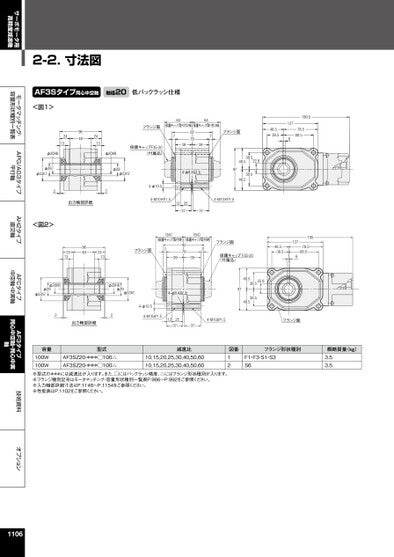 サーボモータ用高精度減速機モータマッチング・容量形状種別一覧表APG/AG3タイプ平行軸AH2タイプ直交軸AFCタイプ中空軸・中実軸AF3タイプ同心中空軸・同心中実軸技術資料オプション2-2.寸法図AF3Sタイプ同心中空軸軸径20低バックラッシ仕様<図1>φ20H8φ29φ53h7241396482413フランジ面64保護キャップ取り付け時64保護キャップ取り付け時7927839397φ20H8保護キャップF3S-20(付属品)φ29φ53h74-φ8.4以上フランジ面199.5127678.568.548.538.538.548.522.89738.548.522出力軸部詳細<図2>4-φ10.54-M10×P1.54-M10×P1.512253737964824132413フランジ面7927873939(64)(64)(保護キャップ取付時)(保護キャップ取付時)フランジ面保護キャップF3S-20(付属品)48.538.519578.568.51276φ20H8φ29φ53h7φ20H8φ29φ53h74-φ8.4以上4-φ10.548.538.522.89738.548.5224-M10xP1.5出力軸部詳細122537374-M10xP1.5フランジ面容量100W100W型式AF3SZ20-***□100△AF3SZ20-***□100△減速比10,15,20,25,30,40,50,6010,15,20,25,30,40,50,60図番12※型式の***には減速比が入ります。また、□にはバックラッシ精度、△にはフランジ形状種別が入ります。※フランジ種別記号はモータマッチング・容量形状種別一覧表P.986~P.992をご参照ください。※入力軸部詳細寸法はP.1148~P.1154をご参照ください。※性能表はP.1102をご参照ください。フランジ形状種別概略質量(kg)F1・F3・S1・S3S63.53.51106