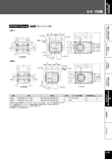 2-2.寸法図サーボモータ用高精度減速機オプション技術資料AF3タイプ同心中空軸・同心中実軸AFCタイプ中空軸・中実軸AH2タイプ直交軸APG/AG3タイプ平行軸モータマッチング・容量形状種別一覧表AF3Sタイプ同心中空軸軸径25低バックラッシ仕様<図1>7979保護キャップ取り付け時保護キャップ取り付け時フランジ面1186427142714φ25H8φ25H8保護キャップF3S-25(付属品)φ39φ66h7φ39φ66h722出力軸部詳細4-φ10.54-M10×P1.514.5<図2>71141005050フランジ面743.553.528.34-φ8.4以上10743.553.52539.539.54-M10×P1.5230.51598105.595.553.543.52714118642714(79)(保護キャップ取付時)(79)(保護キャップ取付時)フランジ面711410050750フランジ面保護キャップF3S-25(付属品)53.543.5226105.595.5159843.528.353.510743.553.52539.539.54-M10xP1.5フランジ面φ25H8φ39φ66h7φ25H8φ39φ66h74-φ8.4以上4-M10xP1.514.54-φ10.52出力軸部詳細2容量100W100W型式AF3SZ25-***□100△AF3SZ25-***□100△減速比80,100,120,160,200,24080,100,120,160,200,240図番12フランジ形状種別概略質量(kg)AF1・F3・S1・S3S655――※型式の***には減速比が入ります。また、□にはバックラッシ精度、△にはフランジ形状種別が入ります。※フランジ種別記号はモータマッチング・容量形状種別一覧表P.986~P.992をご参照ください。※入力軸部詳細寸法はP.1148~P.1154をご参照ください。※性能表はP.1102をご参照ください。1107