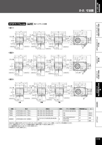 2-2.寸法図サーボモータ用高精度減速機オプション技術資料AF3タイプ同心中空軸・同心中実軸AFCタイプ中空軸・中実軸AH2タイプ直交軸APG/AG3タイプ平行軸モータマッチング・容量形状種別一覧表7376560フランジ面フランジ面737656023075150757フランジ面フランジ面737656029615075757376560フランジ面φ40h6φ40h6φ100h7φ100h74-M20×P2.54-φ20.54-M20×P2.5234-φ17.2以上50737387174φ100h7356.518516727243876969126987103119.5φ20φ40h6φ40h6φ100h7φ100h74-φ17.2以上4-φ20.54-M20×P2.5234-M20×P2.54-M20×P2.55073737376560フランジ面フランジ面737656023075150757フランジ面フランジ面296150757573765607376560フランジ面A185167272438769103119.56987174φ100h7φ40h68769124-M20×P2.5フランジ面φ204-φ17.2以上φ100h7φ100h7φ40h64-φ20.54-M20×P2.54-φ17.2以上235073734-M20×P2.523507373φ40h6φ100h7φ100h7φ40h64-φ20.54-M20×P2.54-M20×P2.57376560フランジ面フランジ面737656015023075775フランジ面フランジ面737656029615075757376560フランジ面φ40h6φ40h6φ100h7φ100h7φ100h7φ40h6φ100h74-φ13.7以上4-φ13.7以上φ40h6174φ100h7738773874-φ16.54-M16×P2.04-M16×P2.023404-φ16.54-M16×P2.04-M16×P2.023404-M16×P2.06363R軸63T軸63A1481342354387731284100.5φ20<図1>23015075757フランジ面φ100h74-φ20.54-M20×P2.523<図2>4-φ17.2以上50737315023075775フランジ面φ100h74-φ20.54-M20×P2.5<図3>フランジ面φ100h74-φ16.54-M16×P2.04-φ17.2以上23507373150230757754-φ13.7以上23406363L軸AF3Fタイプ同心中実軸軸径40低バックラッシ仕様容量750W750W750W型式AF3FZ40#-***□750△AF3FZ40#-***□750△AF3FZ40#-***□750△2000WAF3FZ40#-***□2000△減速比80,100,120,160,200,24080,100,120,160,200,24080,100,120,160,200,240図番1225,7.5,10,12,15,20,25,30,40,50,603フランジ形状種別F1・F2・S1・S2・S3・S4SAS9K21・K22・K23・K31・K32・K33F31・F33概略質量(kg)202020A―352.5356.52121359369※型式の#には軸区分記号(L,R,T)が入ります。また、***には減速比、□にはバックラッシ精度、△にはフランジ形状種別が入ります。※フランジ種別記号はモータマッチング・容量形状種別一覧表P.986~P.992をご参照ください。※入力軸部詳細寸法はP.1148~P.1154をご参照ください。※性能表はP.1104をご参照ください。1119