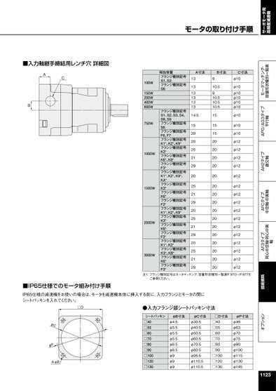 サーボモータ用高精度減速機オプション技術資料AF3タイプ同心中空軸・同心中実軸AFCタイプ中空軸・中実軸AH2タイプ直交軸APG/AG3タイプ平行軸モータマッチング・容量形状種別一覧表■入力軸継手締結用レンチ穴詳細図ACB100W150W200W400W600W750W1000W1500W2000W3000W相当容量フランジ種別記号S1、S3フランジ種別記号S6フランジ種別記号S1、S2、S3、S4、S8、S9フランジ種別記号S6フランジ種別記号F6、F7フランジ種別記号K1*、K2*、K9*フランジ種別記号K3*フランジ種別記号K6*、K8*フランジ種別記号F3*フランジ種別記号K1*、K2*、K9*、KA*フランジ種別記号K3*フランジ種別記号K6*フランジ種別記号F3*フランジ種別記号K1*、K2*、K9*フランジ種別記号K3*フランジ種別記号K6*フランジ種別記号F3*フランジ種別記号K1*、K2*フランジ種別記号K3*、KB*フランジ種別記号K6*フランジ種別記号F3*A寸法B寸法C寸法13131313131314.5152020252129202521292025212920252129910.5910.510.510.515151520202020202020202020202020202020φ10φ10φ10φ10φ10φ10φ10φ10φ10φ12φ12φ12φ12φ12φ12φ12φ12φ12φ12φ12φ12φ12φ12φ12φ12■IP65仕様でのモータ組み付け手順IP65仕様の減速機をお使いの場合は、モータを減速機本体に挿入する前に、入力フランジとモータの間にシートパッキンを入れてください。□D●入力フランジ部シートパッキン寸法注1.フランジ種別記号はモータマッチング、容量形状種別一覧表P.970~P.977をご参照ください。φCPφ4-φBシートパッキン□40□55□60□70□80□90□100□120□130φB寸法φC寸法□D寸法φP寸法φ4.5φ5.5φ5.5φ5.5φ6.5φ6.5φ9φ9φ9φ30.5φ40.5φ50.5φ60.5φ70.5φ80.5φ95.5φ110.5φ110.5□40□55□60□70□80□90□100□120□130φ46φ63φ70φ75φ90φ100φ115φ130φ1451123