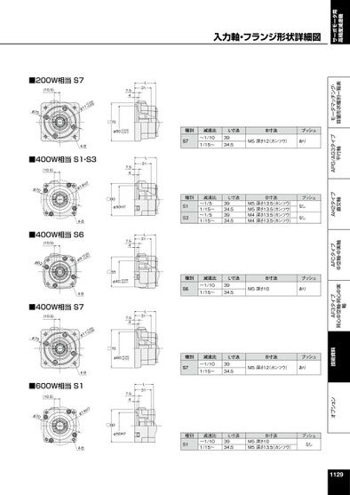 サーボモータ用高精度減速機オプション技術資料AF3タイプ同心中空軸・同心中実軸AFCタイプ中空軸・中実軸AH2タイプ直交軸APG/AG3タイプ平行軸モータマッチング・容量形状種別一覧表■200W相当S7(10.5)L317.54φ7560820.00.0++11φ4-B□70φ60+0.042+0.012L317.54■400W相当S1・S3(10.5)φ707H41φ4-B□60φ50H7■400W相当S6(10.5)L317.54φ63207+20.00.0+9φ4-B■400W相当S7(10.5)φ7560820.00.0++11φ4-B□55φ40+0.036+0.011L317.54□70φ60+0.042+0.012■600W相当S1(10.5)L317.54φ707H41φ4-B□60φ50H7種別減速比L寸法B寸法ブッシュS7~1/101/15~3934.5M5深さ12(カンツウ)あり種別S1S3減速比~1/51/15~~1/51/15~L寸法3934.53934.5B寸法M5深さ13.5カンツウ)M5深さ13.5カンツウ)M4深さ13.5カンツウ)M4深さ13.5カンツウ)ブッシュなしなし種別減速比L寸法B寸法ブッシュS6~1/101/15~3934.5M5深さ10あり種別減速比L寸法B寸法ブッシュS7~1/101/15~3934.5M5深さ12(カンツウ)あり種別S1減速比~1/101/15~L寸法3934.5B寸法M5深さ10M5深さ13.5カンツウ)ブッシュなし1129