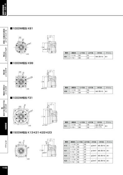 サーボモータ用高精度減速機モータマッチング・容量形状種別一覧表APG/AG3タイプ平行軸AH2タイプ直交軸AFCタイプ中空軸・中実軸AF3タイプ同心中空軸・同心中実軸技術資料オプション種別減速比L1寸法L2寸法B寸法ブッシュK81~1/101/15~62605142M6深さ15ありL1L211□80φ70H77H91φ4-B90φ(20)■1000W相当K81■1000W相当K99L1L2108608200..0+0+61φ□954-Bφ80+0.042+0.012種別減速比L1寸法L2寸法B寸法ブッシュK99~1/101/15~61595041M6深さ15あり100φ(20)4-Bφ110H7種別減速比L1寸法L2寸法B寸法ブッシュF31~1/101/15~70685950M8深さ20(カンツウ)あり種別K13K21K22K23減速比~1/101/15~~1/101/15~~1/101/15~~1/101/15~L1寸法6159615961596159L2寸法5041504150415041A寸法B寸法ブッシュφ24H7M6深さ15ありφ19H7M8深さ16ありφ22H7M8深さ16ありφ24H7M8深さ16ありL1L2108□100φ95H7Aφ4-B15(20)φ1■1500W相当K13・K21・K22・K231132L1L2198□1307H91φ145φ(20)■1000W相当F31