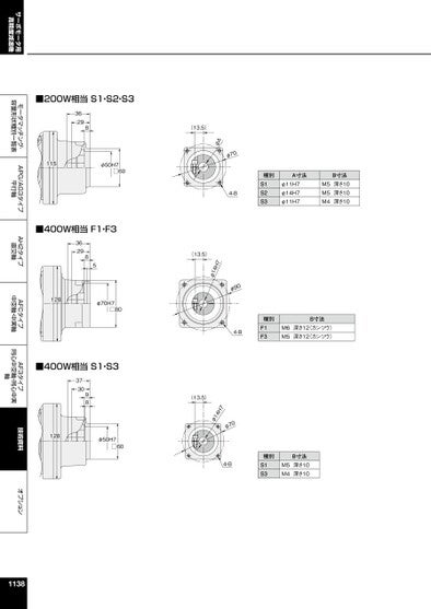 サーボモータ用高精度減速機モータマッチング・容量形状種別一覧表APG/AG3タイプ平行軸AH2タイプ直交軸AFCタイプ中空軸・中実軸AF3タイプ同心中空軸・同心中実軸技術資料オプション種別A寸法S1S2S3φ11H7φ14H7φ11H7B寸法M5深さ10M5深さ10M4深さ10種別F1F3B寸法M6深さ12カンツウ)M5深さ12カンツウ)種別B寸法S1S3M5深さ10M4深さ10(13.5)Aφ07φ4-B09φ4-B14H7φ(13.5)(13.5)7H41φ07φ4-B■200W相当S1・S2・S336298115φ50H7□60■400W相当F1・F3362985128φ70H7□80893730■400W相当S1・S3128φ50H7□601138