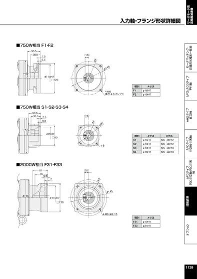 サーボモータ用高精度減速機オプション技術資料AF3タイプ同心中空軸・同心中実軸AFCタイプ中空軸・中実軸AH2タイプ直交軸APG/AG3タイプ平行軸モータマッチング・容量形状種別一覧表■750W相当F1・F250.538.57.55.5142φ110H7□120(16)Aφ541φ4-M8深さ14.5(カンツウ)種別A寸法F1F2φ16H7φ19H7■750W相当S1・S2・S3・S450.538.57.56.5142φ70H7□80(16)Aφ90φ4-B■2000W相当F31・F33815619.57(20)φA種別A寸法S1S2S3S4φ16H7φ19H7φ19H7φ16H7B寸法M6深さ12M6深さ12M5深さ10M5深さ10φ165φ110H7□130φ1544-M8深さ15種別F31F33A寸法φ19H7φ24H71139