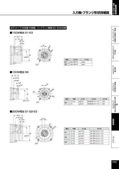 サーボモータ用高精度減速機オプション技術資料AF3タイプ同心中空軸・同心中実軸AFCタイプ中空軸・中実軸AH2タイプ直交軸APG/AG3タイプ平行軸モータマッチング・容量形状種別一覧表AFCタイプ(中空軸・中実軸)バックラッシ精度3分・30分仕様■100W相当S1・S328.5254.54(8)8H7φPφ□40φ30H74-B■100W相当S637292443.5φA□Dφ40+0.036+0.0114-B■200W相当S1・S2・S336.528.57.57□60φ50H74-B(8)36φφ54(10.5)φA07φ種別S1S3B寸法M4深さ10M3深さ10P寸法φ46φ45種別枠番A寸法B寸法D寸法S612・1815+0.007φ9+0.022φ9+0.022+0.007M5深さ8(カンツウ)M5深さ8(カンツウ)□55□56種別枠番A寸法B寸法S1S2S312・1815・2212・1815・2212・1815・22φ11H7φ11H7φ14H7φ14H7φ11H7φ11H7M5深さ10カンツウ)M5深さ15カンツウ)M5深さ10カンツウ)M5深さ15カンツウ)M4深さ10カンツウ)M4深さ15カンツウ)1141