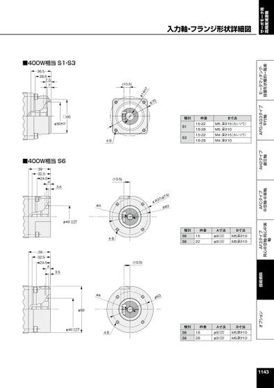 サーボモータ用高精度減速機オプション技術資料AF3タイプ同心中空軸・同心中実軸AFCタイプ中空軸・中実軸AH2タイプ直交軸APG/AG3タイプ平行軸モータマッチング・容量形状種別一覧表■400W相当S1・S336.528.57.57□60φ50H7■400W相当S63932.524.543.5(10.5)4H71φ07φ4-B(10.5)種別枠番B寸法S1S315・2218・2815・2218・28M5深さ15カンツウ)M5深さ10M4深さ15カンツウ)M4深さ10φ40+0.036+0.011φA4-B3932.524.543.5R-4)47(φ73φ63種別枠番A寸法S6S61522(10.5)+0.007φ9+0.022φ9+0.022+0.007φA36φφ82φ40+0.36+0.114-B種別枠番A寸法S6S61828+0.007φ9+0.022φ9+0.022+0.007B寸法M5深さ10M5深さ10B寸法M5深さ10M5深さ101143