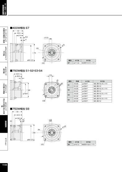 サーボモータ用高精度減速機モータマッチング・容量形状種別一覧表APG/AG3タイプ平行軸AH2タイプ直交軸AFCタイプ中空軸・中実軸AF3タイプ同心中空軸・同心中実軸技術資料オプション■400W相当S74235.527.56.54(10.5)57φφA□70φ60+0.042+0.0124-B種別S7A寸法φ11+0.026+0.008B寸法M5深さ10(カンツウ)■750W相当S1・S2・S3・S444.538.57(15)φA09φ□80φ70H74-B種別枠番A寸法B寸法S1S2S3S418・2822・3218・2822・3218・2822・3218・2822・32φ16H7φ16H7φ19H7φ19H7φ19H7φ19H7φ16H7φ16H7M6深さ10(カンツウ)M6深さ12M6深さ10(カンツウ)M6深さ12M5深さ10(カンツウ)M5深さ12M5深さ10(カンツウ)M5深さ12■750W相当S95544.538.57483φA□90φ80+0.042+0.0124-B(15)001φ種別S9A寸法φ16+0.018+0.008B寸法M6深さ10(カンツウ)1144