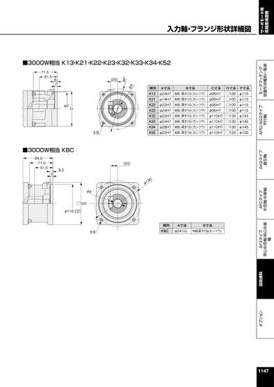 サーボモータ用高精度減速機オプション技術資料AF3タイプ同心中空軸・同心中実軸AFCタイプ中空軸・中実軸AH2タイプ直交軸APG/AG3タイプ平行軸モータマッチング・容量形状種別一覧表1147種別K13K21K22K23K32K33K34K52A寸法φ24H7φ19H7φ22H7φ24H7φ22H7φ24H7φ28H7φ22H7B寸法C寸法M6深さ15(カンツウ)φ95H7M8深さ15(カンツウ)φ95H7M8深さ15(カンツウ)φ95H7M8深さ15(カンツウ)φ95H7M8深さ15(カンツウ)φ110H7M8深さ15(カンツウ)φ110H7M8深さ15(カンツウ)φ110H7M8深さ15(カンツウ)φ110H7D寸法□100□100□100□100□130□130□130□120P寸法φ115φ115φ115φ115φ145φ145φ145φ130φAφP(20)4-B(20)031φφCD7871.551.5■3000W相当KBC84.571.551.59.37■3000W相当K13・K21・K22・K23・K32・K33・K34・K52φA□120φ110+0.35+0.134-B種別KBCA寸法φ24+0.021+0.009B寸法M8深さ15(カンツウ)