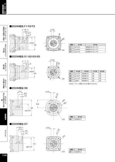 サーボモータ用高精度減速機モータマッチング・容量形状種別一覧表APG/AG3タイプ平行軸AH2タイプ直交軸AFCタイプ中空軸・中実軸AF3タイプ同心中空軸・同心中実軸技術資料オプション種別A寸法B寸法F1F2F3φ11H7φ14H7φ11H7M6深さ12カンツウ)M6深さ12カンツウ)M5深さ12カンツウ)種別S1S2S3S5A寸法φ11H7φ14H7φ11H7φ9H7B寸法M5深さ12M5深さ12M4深さ12M5深さ12F寸法G寸法3636363229292925※S5はバックラッシ精度1分3分仕様のみとなります。09φ4-B4-Bφ3648φ(13.5)φAφA70φ(13.5)φ70H7□80853629■200W相当F1・F2・F3■200W相当S1・S2・S3・S5FG8φ50H7□60+0.0079+0.015φ(13.5)■200W相当S627.520.53.540.5□82φ40+0.036+0.011種別S6B寸法M5深さ124-B57φ+0.00811+0.018φ(13.5)■200W相当S734.527.56.53.5□70φ60+0.042+0.01211504-B種別S7B寸法M5深さ12