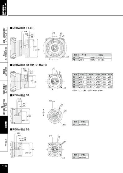 サーボモータ用高精度減速機モータマッチング・容量形状種別一覧表APG/AG3タイプ平行軸AH2タイプ直交軸AFCタイプ中空軸・中実軸AF3タイプ同心中空軸・同心中実軸技術資料オプション4-B種別A寸法F1F2φ16H7φ19H7B寸法M8深さ14(カンツウ)M8深さ14(カンツウ)種別S1S2S3S4S6A寸法φ16H7φ19H7φ19H7φ16H7φ14+0.030+0.012B寸法M6深さ12M6深さ12M5深さ10M5深さ10M6深さ12D寸法φ70H7φ70H7φ70H7φ70H7φ80H7E寸法□80□80□80□80□90P寸法φ90φ90φ90φ90φ100※S6はバックラッシ精度1分3分仕様のみとなります。種別S7B寸法M5深さ12800.0+φ11+0.0264-B57φ4-B■750W相当F1・F250.538.57.55.5(16)541φφAφ110H7□120AφφP(16)50.538.57.55.5■750W相当S1・S2・S3・S4・S6φD□E001φ4-B種別S7B寸法M6深さ12+000816+0.018φ■750W相当SA33.525.54.53.548φ100φ60+0.042+0.012■750W相当S950.538.57.56.5□90φ80+0.042+0.012(16)(16)1152