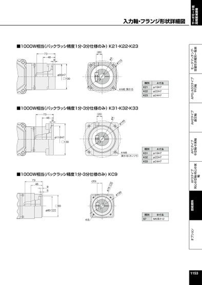 サーボモータ用高精度減速機オプション技術資料AF3タイプ同心中空軸・同心中実軸AFCタイプ中空軸・中実軸AH2タイプ直交軸APG/AG3タイプ平行軸モータマッチング・容量形状種別一覧表001φ種別S7B寸法M6深さ121153800.0+6+0.0261φ734895□90φ80+0.042+0.012(20)4-B■1000W相当(バックラッシ精度1分・3分仕様のみ)K21・K22・K2373489φ95H7□100(20)Aφ511φ4-M8深さ15種別A寸法K21K22K23φ19H7φ22H7φ24H7■1000W相当(バックラッシ精度1分・3分仕様のみ)K31・K32・K33(20)Aφ541φ73489φ110H7□1304-M8深さ19(カンツウ)種別A寸法K31K32K33φ19H7φ22H7φ24H7■1000W相当(バックラッシ精度1分・3分仕様のみ)KC9