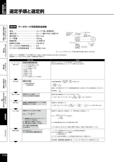 サーボモータ用高精度減速機モータマッチング・容量形状種別一覧表APG/AG3タイプ平行軸AH2タイプ直交軸AFCタイプ中空軸・中実軸AF3タイプ同心中空軸・同心中実軸技術資料オプション選定手順と選定例選定例サーボモータ用高精度減速機用途…………………………………コンベア(軽い衝撃負荷)連結方式……………………………チェーン(軸の中央に位置する)搬送速度V…………………………30m/minワーク質量…………………………100kg稼働時間……………………………12時間/日起動停止回数………………………720回/日チェーンとガイドの摩擦係数μ……0.2サーボモータ定格回転速度………3000r/minスプロケット(2)P.C.D.3005kg/個スプロケット(1)P.C.D.250V=30m/min100kgチェーン(1)チェーン(2)20kgμP.C.D.125当社ホームページ計算選定ツールをご利用ください。(https://sentei.nissei-gtr.co.jp/servo_calculation)使用条件・シリーズを入力すると、WEB上で容量計算が可能です。チェーン(1)、スプロケット(1)、その他の条件は計算に含まないものとする。シリーズ・バックラッシ精度の決定選定の手順中空軸・平行軸・直交軸の決定コンパクト平行軸・遊星タイプAPG・コンパクト中空軸タイプAFC・コンパクト中実軸タイプAFC・中空軸タイプAF3・中実軸タイプAF3・平行軸タイプAG3・・直交軸タイプAH2※バックラッシ精度はシリーズにより異なる取り付けスペースより、コンパクト平行軸・遊星タイプAPGに決定する。繰り返し停止精度は要求しないため、バックラッシ精度は15分に決定する。選定例速比の決定減速比(i)の決定i=出力軸必要回転速度入力軸回転速度30×1000300×π×250125≒63.66r/min出力軸必要回転速度=i=63.663000≒147.12負荷トルクの検討実負荷トルク(TLE)の算出サービスファクタ(Sf)P.1176[表-1]負荷条件(軽い衝撃負荷)より、サービスファクタ(Sf)=1.25TLE=9.8×(100+5×2+20)×0.2×3002×1000×125250×1.25=23.89N・m減速比1/50を選定するとサーボモータ定格回転速度3000r/minを超えてしまうため、選定減速比は1/40とする。選定減速比i=140×5×2+20)×(3002×1000)2×(125250)2×(140)2×3=0.00131836kg・m212Jℓ=(100+慣性の検討減速機入力軸換算負荷慣性モ-メント(Jℓ)の算出補正係数(C)P.1177[表-1]運転条件より、補正係数(C)=3O.H.L.の検討実負荷トルク(TLE)によるO.H.L.の算出運転条件より、連結方式による係数(fb)=1.3荷重の程度による係数(fw)=1.3O.H.L.=TLE×fb×fwRO.H.L.=23.89×1.3×1.3125=645.99NR:減速機軸に取り付けられるスプロケット・プーリ・2×1000ギアなどのピッチ円半径(m)fb:連結方式による係数P.1179[表-1]fw:荷重の程度による係数P.1179[表-2]O.H.L.位置による許容値の補正P.1180[表-1]機種の仮選定トルク・O.H.L.よりすべての条件を満足する機種を選定するO.H.L.荷重位置は軸の中央のため、許容値の補正は不要※ベルトの張力など、他にもO.H.L.に影響する要素がある場合は、お客様にて数値の追加を行ってください。TLE≦モータ定格時出力トルク(N・m)P.1156性能表[計算選定用]O.H.L.≦出力軸許容O.H.L.(N)<性能表>となる機種を選定する※サーボモータ自体に負荷慣性モーメントの許容値がある場合はあわせてご確認ください。仮選定機種APGZ22K-40Q400△N※△はサーボモータ取り付けフランジ種別記号が入ります。1174