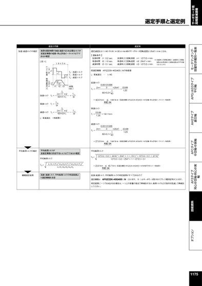 サーボモータ用高精度減速機オプション技術資料AF3タイプ同心中空軸・同心中実軸AFCタイプ中空軸・中実軸AH2タイプ直交軸APG/AG3タイプ平行軸モータマッチング・容量形状種別一覧表仮選定機種APGZ22K-40Q400△Nの性能値iz:実減速比…1/40加速トルク0.00131836TP=2π×3×254760×0.2×140+23.891.25=42.6N・m≦144N・m仮選定機種APGZ22K-40Q400△Nの起動・停止許容ピークトルク<性能表>判定OK等速トルクTL=23.891.25=19.1N・m減速トルク0.00131836TP=2π×3×254760×0.1×140-23.891.25TP:加速トルクTL:等速トルクTS:減速トルクTSt3時間(sec.)加速トルクTP=等速トルクTL=減速トルクTS=JℓC×n22π×60×t1×iZ+TLESfTLESf2π×JℓC×n260×t3×iZ-TLESfiz:実減速比<性能表>TLTP(N・m)負荷トルクt2n3n2t1n1(r/min)入力回転速度選定の手順選定例加速・減速トルクの検討負荷を規定時間で加速・減速するため必要なトルクが仮選定機種の起動・停止許容ピークトルク以下であるか確認[図-1]1サイクル選定減速比は1/40のため、V=30m/min時のサーボモータ回転速度は2547r/minとなる。【運転条件】加速時間t1:0.2sec.加速時入力回転速度n1:1273.5r/min等速時間t2:1.0sec.等速時入力回転速度n2:2547r/min減速時間t3:0.1sec.減速時入力回転速度n3:1273.5r/min※加減時入力回転速度n1、減速時入力回転速度n3は等速時入力回転速度n2の平均値(n2/2)とする=27.8N・m≦144N・m仮選定機種APGZ22K-40Q400△Nの起動・停止許容ピークトルク<性能表>判定OK平均負荷トルクの検討平均負荷トルクが仮選定機種の許容平均トルク以下であるか確認平均負荷トルク3TM=n1×t1×│TP│3+n2×t2×│TL│3+n3×t3×│TS│3n1×t1+n2×t2+n3×t3平均負荷トルク3TM=1273.5×0.2×│42.6│3+2547×1×│19.1│3+1273.5×0.1×│27.8│31273.5×0.2+2547×1+1273.5×0.1=23.9N・m≦40.7N・m仮選定機種APGZ22K-40Q400△Nの許容平均トルク<性能表>判定OK機種選定結果加速・減速トルク、平均負荷トルクの判定結果より選定機種を決定加速・減速トルク、平均負荷トルクの判定結果がすべてOKなので選定機種はAPGZ22K-40Q400△Nとなります。※△はサーボモータ取り付けフランジ種別記号が入ります。判定結果に一つでもNGがある場合は、一つ上の容量の型式で再検討するか、負荷トルクなどの条件を低減して再検討してください。1175