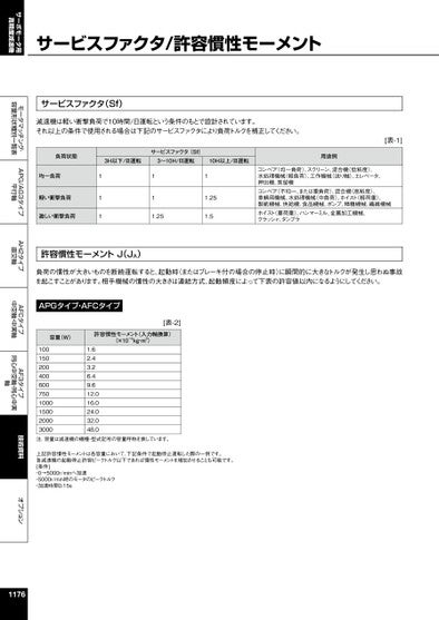 サーボモータ用高精度減速機モータマッチング・容量形状種別一覧表APG/AG3タイプ平行軸AH2タイプ直交軸AFCタイプ中空軸・中実軸AF3タイプ同心中空軸・同心中実軸技術資料オプションサービスファクタ/許容慣性モーメントサービスファクタ(Sf)減速機は軽い衝撃負荷で10時間/日運転という条件のもとで設計されています。それ以上の条件で使用される場合は下記のサービスファクタにより負荷トルクを補正してください。[表-1]負荷状態均一負荷軽い衝撃負荷激しい衝撃負荷111サービスファクタ(Sf)3H以下/日運転3~10H/日運転10H以上/日運転用途例111.2511.251.5コンベア(均一負荷)、スクリーン、混合機(低粘度)、水処理機械(軽負荷)、工作機械(送り軸)、エレベータ、押出機、蒸留機コンベア(不均一、または重負荷)、混合機(高粘度)、車輌用機械、水処理機械(中負荷)、ホイスト(軽荷重)、製紙機械、供給機、食品機械、ポンプ、精糖機械、繊維機械ホイスト(重荷重)、ハンマーミル、金属加工機械、クラッシャ、タンブラ許容慣性モーメントJ(JA)負荷の慣性が大きいものを断続運転すると、起動時(またはブレーキ付の場合の停止時)に瞬間的に大きなトルクが発生し思わぬ事故を起こすことがあります。相手機械の慣性の大きさは連結方式、起動頻度によって下表の許容値以内になるようにしてください。APGタイプ・AFCタイプ[表-2]容量(W)許容慣性モーメント(入力軸換算)(×10-4kg・m2)10015020040060075010001500200030001.62.43.26.49.612.016.024.032.048.0注.容量は減速機の機種・型式記号の容量呼称を表しています。上記許容慣性モーメントは各容量において、下記条件で起動停止運転した際の一例です。各減速機の起動停止許容ピークトルク以下であれば慣性モーメントを増加させることも可能です。[条件]・0→5000r/minへ加速・5000r/min時のモータのピークトルク・加速時間0.15s1176