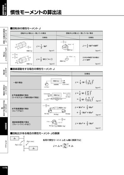 モータマッチング・容量形状種別一覧表APG/AG3タイプ平行軸AH2タイプ直交軸AFCタイプ中空軸・中実軸AF3タイプ同心中空軸・同心中実軸技術資料オプションサーボモータ用高精度減速機SI単位(kg・m2)J=Mr2+MR212(大きさが無視できる場合)J=MR2(kg・m2)R(m))mD(質量M(kg)R(m)(m)D2r=質量M(kg)(kg・m2)SI単位J=Mr2122221J=M(r+r)12質量M(kg)(m)D2r=)mD(質量M(kg)(kg・m2))mD()m(d(m)(m)D2d2r1=r2=慣性モーメントの算出法■回転体の慣性モーメントJ回転中心が重心と一致している場合回転中心が重心と一致していない場合(kg・m2)(kg・m2)SI単位2・nVπM・22Pπ・nVπM・M・141414J=J==12J=M1r2+M2r2(kg・m2)+M3r2+M4r212(kg・m2)12J=M1r2+M2r2一般の場合質量M(kg)直線運動速度V(m/min)nr/min)水平直線運動の場合(リードネジによって物体を動かす場合)V(m/min)質量M(kg)P=リードネジのリード(m/rev)質量M1(kg)D()mM3[kg]M2(kg)M4[kg])mD(リードネジ(m)D2r=M2(kg)質量M1(kg)(m)D2r=ロープドラム)mD(水平直線運動の場合(コンベアなど)垂直直線運動の場合(クレーン・ウインチなど)■回転比がある場合の慣性モーメントJの換算■直線運動をする場合の慣性モーメントJ負荷の慣性モーメントJbをna軸に換算するとJ=Ja+×Jbnbna2Janar/min)nbr/min)Jb1178