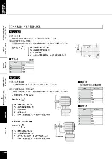 サーボモータ用高精度減速機モータマッチング・容量形状種別一覧表APG/AG3タイプ平行軸AH2タイプ直交軸AFCタイプ中空軸・中実軸AF3タイプ同心中空軸・同心中実軸技術資料オプション■定数B(出力軸許容O.H.L.荷重の位置)枠番B(mm)1215182228322235354143.548.5■定数C枠番C(mm)1215182228325052586878.591.5出力軸許容O.H.L.は、フランジ面からBmmにて算出しています。(2)出力軸許容O.H.L.荷重の補正ご使用になる条件にしたがい、出力軸許容O.H.L.を以下の式で補正してください。a.片側をピローで受けない時FxBLFx使用可能O.H.L.(N)出力軸許容O.H.L.(N)定数(mm)定数(mm)O.H.L.荷重位置(フランジ面からの距離)mm):::::FxFcBCLFx=Fc×C+BC+Lb.片側をピローで受ける時Fx=Fc×RR-LLR相手機械被動軸使用可能O.H.L.(N)出力軸許容O.H.L.(N)フランジ面からピロー中心までの距離(mm)O.H.L.荷重位置(フランジ面からの距離)mm)::::FxFcRL■定数A[表-1]枠番A(mm)1218222823.53238.543.5AFCタイプ(1)O.H.L.荷重位置1180FcFxLAPGタイプの出力軸許容O.H.L.は、軸の中央で算出しています。(2)出力軸許容O.H.L.の補正ご使用になる条件にしたがい、出力軸許容O.H.L.を以下の式で補正してください。使用可能O.H.L.(N)出力軸許容O.H.L.(N)定数(mm)O.H.L.荷重位置(軸中央からの変位量)(mm)::::FxFcALFx=Fc×AA+LO.H.L.位置による許容値の補正APGタイプ(1)O.H.L.位置