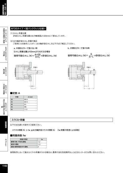 モータマッチング・容量形状種別一覧表APG/AG3タイプ平行軸AH2タイプ直交軸AFCタイプ中空軸・中実軸AF3タイプ同心中空軸・同心中実軸技術資料オプションサーボモータ用高精度減速機AF3Sタイプ<低バックラッシ仕様>(1)O.H.L.荷重位置許容O.H.L.荷重位置は出力軸端面より20mmにて算出しています。(2)出力軸許容O.H.L.荷重の補正ご使用になる条件にしたがい、出力軸許容O.H.L.を以下の式で補正してください。b.片側をピローで受ける時使用可能O.H.L.(N)=×許容O.H.L.(N)SS-L荷重点LSa.片側をピローで受けない時O.H.L.荷重位置Lが20mmより大きくなる場合使用可能O.H.L.(N)=×許容O.H.L.(N)A+20A+L荷重点20L■定数A枠番A(mm)202530354568.584.59198113スラスト荷重以下の式を満たす条件でご使用ください。スラスト荷重(N)×fw≦出力軸許容スラスト荷重(N)〔fw:荷重の程度による係数〕■荷重係数fw荷重の程度衝撃の無い円滑な運転普段の運転振動・衝撃荷重を伴う運転fw1.21.32使用条件において過大なスラスト荷重がかかる場合は、最寄の当社各営業所もしくはCSセンターまでお問い合わせください。1182