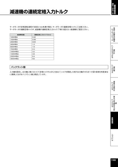 オプション技術資料AF3タイプ同心中空軸・同心中実軸AFCタイプ中空軸・中実軸AH2タイプ直交軸APG/AG3タイプ平行軸モータマッチング・容量形状種別一覧表サーボモータ用高精度減速機減速機の連続定格入力トルクサーボモータの定格回転速度が3000r/min未満の場合、サーボモータの連続定格トルクにご注意ください。サーボモータの連続定格トルクが、減速機の連続定格入力トルク(下表)を超えない減速機をご選定ください。減速機容量連続定格入力トルク(N・m)0.320.480.641.31.92.43.24.86.49.6100W相当150W相当200W相当400W相当600W相当750W相当1000W相当1500W相当2000W相当3000W相当バックラッシ値入力軸を固定し、出力軸に微小なトルク(定格トルクの±5%)を加えて、トルクを開放した時の出力軸のゼロ点への戻り誤差を角度単位に換算したものをバックラッシ値と規定しています。1183
