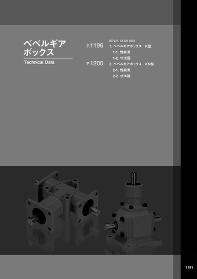 ベベルギアボックスTechnicalDataP.1196P.1200BEVELGEARBOX1.ベベルギアボックスK型1-1.性能表1-2.寸法図2.ベベルギアボックスKN型2-1.性能表2-2.寸法図1191