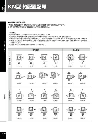 ベベルギアボックス技術資料ベベルギアボックスKN型軸配置記号■軸配置と軸配置記号KN型は、軸の出る方向・回転関係により24とおりの軸配置のものを標準化しています。そのため型式記号だけでなく軸配置についてもご検討ください。【注意事項】●本図は取り付けベースと水平面取り付け(床面取り付け)を表示しています。●矢印の回転方向は各軸の回転方向関係を示すもので方向を限定するものではありません。正転逆転共可能です。●▼印は水平面取り付け(床面取り付け)時の給油口、ドレンプラグのある壁面を示しております。無印のものは本図裏面側となります。標準仕様)●軸配置、HU型」以外で入力軸(X軸)が上向きにご使用される壁面取り付けの場合は、ベアリングの潤滑方式が異なりますので、ご注文の際は、その旨ご指示ください。●水平面取り付け以外でご使用の場合はP.1213をご参照ください。KNB型KNC型HH1043HH1044HH1033HH1034HH1343HH1344HH1022HH1025HH1052HH1055HH1252HH1255HU2043HU2044HU2033HU2034HU2343HU2344HD5043HD5044HD5033HD5034HD5343HD5344ヨコ型(平面図)タテ型(正面図)1194