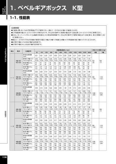 ベベルギアボックス技術資料ベベルギアボックス1196速比型式仕様記号X軸回転速度(r/min)許容スラスト荷重(N){kgf}5010020030040060090012001500180025003600X軸Y軸1:1KC-101KB-101許容伝達容量(kW)0.010.020.050.070.090.140.200.260.310.350.380.4459{6}69{7}許容X軸O.H.L.(N・m){kgfm}許容X・Y軸トルク2.35{0.24}2.35{0.24}2.25{0.23}2.25{0.23}2.16{0.22}2.16{0.22}2.06{0.21}2.06{0.21}1.96{0.20}1.86{0.19}1.47{0.15}1.18{0.12}(N){kgf}78{8}12778{8}12778{8}11878{8}11869{7}11869{7}11869{7}10869{7}10869{7}10859{6}49{5}39{4}許容Y軸O.H.L.(N){kgf}{13}{13}{12}{12}{12}{12}{11}{11}{11}98{10}78{8}59{6}KB-151KC-151許容伝達容量(kW)0.050.090.180.270.350.510.750.961.161.301.441.6698{10}118{12}(N・m){kgfm}許容X・Y軸トルク許容X軸O.H.L.8.82{0.90}8.82{0.90}8.62{0.88}8.53{0.87}8.33{0.85}8.13{0.83}7.94{0.81}7.64{0.78}7.35{0.75}6.86{0.70}5.49{0.56}4.41{0.45}(N){kgf}255{26}255{26}255{26}245{25}245{25}235{24}225{23}216{22}216{22}186{19}157{16}127{13}許容Y軸O.H.L.(N){kgf}294{30}294{30}284{29}284{29}274{28}265{27}265{27}255{26}245{25}216{22}176{18}147{15}KB-201KC-201許容伝達容量(kW)0.090.180.360.520.680.951.381.782.152.502.552.95196{20}274{28}(N・m){kgfm}許容X・Y軸トルク許容X軸O.H.L.17.6{1.80}17.6{1.80}17.2{1.75}16.7{1.70}16.2{1.65}15.2{1.55}14.7{1.50}14.2{1.45}13.7{1.40}13.2{1.35}9.80{1.00}7.84{0.80}(N){kgf}353{36}353{36}343{35}333{34}333{34}323{33}314{32}304{31}294{30}265{27}216{22}176{18}許容Y軸O.H.L.(N){kgf}529{54}529{54}519{53}510{52}500{51}490{50}470{48}451{46}441{45}392{40}314{32}255{26}1:2KB-102KC-102許容伝達容量(kW)0.0050.010.020.030.040.060.090.120.140.160.170.2059{6}69{7}許容Y軸トルク(N・m){kgfm}許容X軸O.H.L.2.06{0.21}2.06{0.21}2.06{0.21}1.96{0.20}1.96{0.20}1.96{0.20}1.86{0.19}1.86{0.19}1.76{0.18}1.67{0.17}1.27{0.13}1.08{0.11}(N){kgf}88{9}13788{9}13788{9}13788{9}12788{9}12778{8}12778{8}12778{8}11878{8}11869{7}10859{6}49{5}許容Y軸O.H.L.(N){kgf}{14}{14}{14}{13}{13}{13}{13}{12}{12}{11}88{9}69{7}KB-152KC-152許容伝達容量(kW)0.020.040.080.130.170.250.360.460.550.620.690.8098{10}118{12}許容Y軸トルク(N・m){kgfm}許容X軸O.H.L.8.43{0.86}8.43{0.86}8.23{0.84}8.13{0.83}8.04{0.82}7.84{0.80}7.55{0.77}7.25{0.74}7.06{0.72}6.57{0.67}5.29{0.54}4.21{0.43}(N){kgf}255{26}255{26}255{26}245{25}245{25}235{24}225{23}216{22}216{22}186{19}157{16}127{13}許容Y軸O.H.L.(N){kgf}294{30}294{30}284{29}284{29}274{28}265{27}265{27}255{26}245{25}216{22}176{18}147{15}KB-202KC-202許容伝達容量(kW)0.050.100.190.280.370.530.770.991.151.311.401.57196{20}274{28}許容Y軸トルク(N・m){kgfm}許容X軸O.H.L.19.6{2.00}19.6{2.00}18.6{1.90}18.1{1.85}17.6{1.80}17.0{1.73}16.4{1.67}15.7{1.60}14.7{1.50}13.9{1.42}10.8{1.10}8.33{0.85}(N){kgf}372{38}372{38}363{37}363{37}353{36}343{35}333{34}323{33}314{32}274{28}235{24}186{19}許容Y軸O.H.L.(N){kgf}588{60}588{60}578{59}568{58}559{57}539{55}529{54}510{52}490{50}441{45}363{37}294{30}【注意事項】●この性能表の値はサービスファクタが1の時のものです。それ以外の条件でご使用の場合はP.1208表-1]サービスファクタをご参照ください。●ご使用に際しましては必ず許容値以下でご使用ください。速比(1:2)のものはY軸への減速になります。●O.H.L.(オーバーハングロード)とは軸長中央部分にかけ得る許容荷重です。それ以外の条件でご使用の場合はP.1208[表-2,表-3]係数K1、K2をご参照ください。●KC型のY軸トルクは左右の軸の合計値です。●速比(1:2)のタイプのものを増速で使用する場合(Y軸よりX軸への増速)はX軸トルクが性能表の値(Y軸トルク)の1/2になります。●KC型のY軸O.H.L.は左右の軸の合計値です。1.ベベルギアボックスK型1-1.性能表