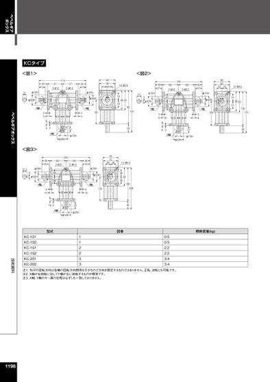 ベベルギアボックス技術資料ベベルギアボックス6662222217512-φ8.53131804814017030φ15h7φ42H7Y軸100302738192663-φ18663-φ8.53136313183X軸27φ15h7φ42H7302738<図2>17φ15h75φ42H7Y軸40381414912-φ5.51818464882102202015114373-φ12373-φ6.52015φ10h7φ26H758Y軸25181825Y軸9φ10h7φ26H71818KCタイプ<図1>52X軸15φ10h7φ26H7型式図番概略質量(kg)KC-101KC-102KC-151KC-152KC-201KC-2021122330.50.52.22.23.43.4注1.矢印の回転方向は各軸の回転方向関係を示すもので方向を限定するものではありません。正転、逆転とも可能です。注2.X軸が右回転に対してY軸が左に回転するものが標準です。注3.X軸、Y軸のキー溝の位相は必ずしも一致しておりません。240803-φ20803-φ8.5403536367672262622.5612-φ8.5363692φ20h7φ52H716620640120Y軸0413636104X軸35φ20h7φ52H7<図3>22.56φ20h7φ52H7Y軸40354101198