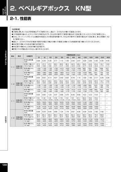 ベベルギアボックス技術資料ベベルギアボックス1200速比型式仕様記号X軸回転速度(r/min)4002050100200300600900120015001800250036001:1KNB-191KNC-191許容伝達容量(kW)0.080.200.390.771.151.502.052.673.303.954.404.404.40(N・m){kgfm}許容X・Y軸トルク許容X軸O.H.L.37.2{3.8}37.2{3.8}37.2{3.8}36.3{3.7}36.3{3.7}36.3{3.6}32.3{3.3}28.4{2.9}26.5{2.7}24.5{2.5}23.5{2.4}16.7{1.7}10.8{1.1}(N){kgf}1760{180}1760{180}1760{180}1760{180}1670{170}1620{165}1270{130}1080{110}882{90}1030833{85}784{80}686{70}637{65}許容Y軸O.H.L.(N){kgf}1960{200}1960{200}1960{200}1960{200}1960{200}1810{185}1470{150}1180{120}{105}980{100}931{95}784{80}735{75}1:2KNB-192KNC-192許容伝達容量(kW)0.030.070.140.270.400.530.781.151.501.852.172.202.20(N・m){kgfm}許容X・Y軸トルク許容X軸O.H.L.25.5{2.6}25.5{2.6}25.5{2.6}25.5{2.6}25.5{2.6}24.5{2.5}24.5{2.5}24.5{2.5}23.5{2.4}23.5{2.4}22.5{2.3}16.7{1.7}10.8{1.1}(N){kgf}1180{120}1180{120}1180{120}1180{120}1180{120}1130{115}1130{115}1080{110}1080{110}8821080{90}833{85}784{80}735{75}許容Y軸O.H.L.(N){kgf}1760{180}1760{180}1760{180}1760{180}1760{180}1720{175}1670{170}1470{150}1270{130}{110}980{100}833{85}784{80}1:1KNC-251KNB-251許容伝達容量(kW)0.250.621.242.473.684.706.408.6010.512.313.8――許容X軸O.H.L.(N・m){kgfm}許容X・Y軸トルク118{12.0}118{12.0}118{12.0}118{12.0}116{11.8}112{11.4}101{10.3}91.12450{9.3}83.32160{8.5}78.41960{8.0}73.51760{7.5}――(N){kgf}3920{400}3920{400}3920{400}3920{400}3630{370}3330{340}2940{300}{250}{220}{200}{180}――許容Y軸O.H.L.(N){kgf}4120{420}4120{420}4120{420}4120{420}4020{410}3920{400}3430{350}2940{300}2550{260}2450{250}2250{230}――1:2KNB-252KNC-252許容伝達容量(kW)0.090.230.450.901.341.782.674.005.306.337.507.50―許容Y軸トルク(N・m){kgfm}許容X軸O.H.L.85.3{8.7}85.3{8.7}85.3{8.7}85.3{8.7}85.3{8.7}84.3{8.6}84.3{8.6}84.3{8.6}84.3{8.6}80.4{8.2}79.4{8.1}56.8{5.8}―(N){kgf}3920{400}3920{400}3920{400}3920{400}3920{400}3720{380}3630{370}3530{360}3230{330}2740{280}2250{230}1670{170}―許容Y軸O.H.L.(N){kgf}4120{420}4120{420}4120{420}4120{420}4020{410}3920{400}3820{390}3720{380}3430{350}3040{310}2650{270}2350{240}―【注意事項】●この性能表の値はサービスファクタが1の時のものです。それ以外の条件でご使用の場合はP.1208表-1]サービスファクタをご参照ください。●ご使用に際しましては必ず許容値以下でご使用ください。速比(1:2)のものはY軸への減速になります。●O.H.L.(オーバーハングロード)とは軸長中央部分にかけ得る許容荷重です。それ以外の条件でご使用の場合はP.1208[表-2,表-3]係数K1、K2をご参照ください。●KNC型のY軸O.H.L.は左右の軸の合計値です。●KNC型のY軸トルクは左右の軸の合計値です。●速比(1:2)のタイプのものを増速で使用する場合(Y軸よりX軸への増速)はX軸トルクは性能表の値(Y軸トルク)の1/2になります。●許容スラスト荷重は各々のO.H.L.値の半分になります。2.ベベルギアボックスKN型2-1.性能表