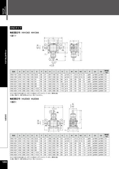 ベベルギアボックス技術資料ベベルギアボックスK76769090100100115115LMN1N2OPQ1Q2φ10.5φ10.5φ14φ14φ14φ14φ14φ14171720202020222221.520.528283535434321.521.5282835354343668810101212φ66φ66φ92φ92φ100φ100φ124φ124φ19h6φ18h6φ25h6φ25h6φ32h6φ32h6φ40h6φ40h6φ19h6φ19h6φ25h6φ25h6φ32h6φ32h6φ40h6φ40h6概略質量(kg)1010181823233434K5353656574748585LMN1N2OPQ1Q2φ10.5φ10.5φ14φ14φ14φ14φ14φ14171720202020222221.520.528283535434321.521.5282835354343668810101212φ66φ66φ92φ92φ100φ100φ124φ124φ19h6φ18h6φ25h6φ25h6φ32h6φ32h6φ40h6φ40h6φ19h6φ19h6φ25h6φ25h6φ32h6φ32h6φ40h6φ40h6概略質量(kg)1010181823233434ⅠHN1OJKN28CDQ2FGY軸ME4-L型式ABCDEFGHⅠJ232232314314336336416416KNC-191KNC-192KNC-251KNC-252KNC-321KNC-322KNC-401KNC-4025353656574748585※オイル栓の大きさは給入口→PF1/2、排出口→PT1/4になっています。標準仕様)※X軸、Y軸のキー溝の位相は必ずしも一致しておりません。53.553.581818888110.5110.511611615715716816820820815415418818819619623423412512515215216016019519525725731631634034042542518018022222224224230830838385050555575752727404050506060BGFBQ1X軸APJDCⅠN2Q2OFGY軸E型式ABCDEFGH軸配置記号:HU2343HU2344<図2>232232314314336336416416KNC-191KNC-192KNC-251KNC-252KNC-321KNC-322KNC-401KNC-4025656686877778888※オイル栓の大きさは給入口→PF1/2、排出口→PT1/4になっています。標準仕様)※X軸、Y軸のキー溝の位相は必ずしも一致しておりません。53.553.581818888110.5110.5116116157157168168208208154154188188196196234234125125152152160160195195256256312312342342423423180180222222242242308308383850505555757527274040505060601204JKN2OEFGQ2Y軸DC146HⅠMBCDABPX軸Q1OFGN1EFG4-LQ2Y軸N2OKNCタイプ軸配置記号:HH1343HH1344<図1>