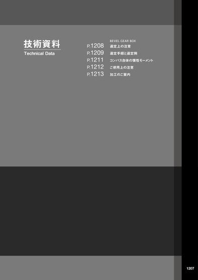 技術資料TechnicalDataP.1208P.1209P.1211P.1212P.1213BEVELGEARBOX選定上の注意選定手順と選定例コンパス自体の慣性モーメントご使用上の注意加工のご案内1207