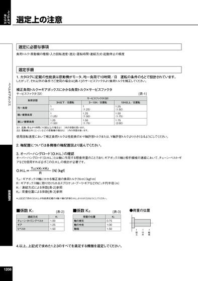 ベベルギアボックス技術資料ベベルギアボックス選定手順1.カタログに記載の性能表は原動機がモータ、均一負荷で10時間/日運転の条件のもとで設計されています。したがって、それ以外の条件でご使用の場合は[表-1]のサービスファクタより負荷トルクを補正してください。使用回転速度において補正負荷トルクは性能表のX・Y軸許容トルクまたは、Y軸許容トルクより小さくなるようにしてください。2.軸配置については各機種の軸配置図より選んでください。3.オーバーハングロード(O.H.L.)の確認オーバーハングロード(O.H.L.)とは軸に作用する懸垂荷重のことであり、ギアボックス軸と相手機械の連結において、チェーン・ベルト・ギアなどを使用すれば必ずこのO.H.L.の検討が必要です。補正負荷トルク=ギアボックスにかかる負荷トルク×サービスファクタサービスファクタ(Sf)[表-1]負荷状態3H以下/日運転サービスファクタ(Sf)3~10H/日運転10H以上/日運転1.25(1.50)1.50(1.75)1.75(2.00)1.25)1(1.25(1.50)1.50(1.75)1.25)1(1.25(1.50)1)1(均一負荷軽い衝撃負荷激しい衝撃負荷注1.起動、停止が1時間に10回以上の場合は()内の係数を使います。注2.電動機以外(エンジンなど)の原動機の場合も()内の係数を使います。選定に必要な事項負荷トルク・原動機の種類・入力回転速度・速比・運転時間・連結方式・起動停止の頻度●荷重の位置軸端中央根元O.H.L.=TLE×K1×K2R(N){kgf}TLE:ギアボックス軸にかかる補正後の負荷トルク(N・m){kgfm}R:ギアボックス軸に取り付けられるスプロケット・プーリ・ギアなどのピッチ円半径(m)K1:連結方式による係数[表-2]参照K2:荷重位置による係数[表-3]参照*上記式で求めたO.H.L.が性能表記載のX軸・Y軸の許容O.H.L.より小さくなるようにしてください。■係数K1連結方式チェーン・タイミングベルトギアVベルト[表-2]K1■係数K2荷重の位置1.001.251.50軸の根元軸の中央軸端[表-3]K20.751.001.504.以上、上記式で求めた1.2.3のすべてを満足する機種を選定してください。選定上の注意1208