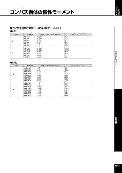 技術資料ベベルギアボックスベベルギアボックスコンパス自体の慣性モーメント■コンパス自体の慣性モーメント{GD2}(X軸換算値)●K型速比型式記号慣性モーメント(X10-4kg・m2){GD2(X10-4kg・m2)}KB-101KC-101KB-151KC-151KB-201KC-201KB-102KC-102KB-152KC-152KB-202KC-2020.0450.0480.530.561.81.90.0220.0220.370.370.790.821:11:2●KN型0.180.192.12.27.27.80.0860.0891.51.53.13.3速比型式記号慣性モーメント(X10-4kg・m2){GD2(X10-4kg・m2)}1:11:2KNB-191KNC-191KNB-251KNC-251KNB-321KNC-321KNB-401KNC-401KNB-192KNC-192KNB-252KNC-252KNB-322KNC-322KNB-402KNC-4024.04.124.825.040.040.889.592.01.91.910.310.412.913.138.338.816.016.299.31001601633583687.47.541.341.651.752.41531551211