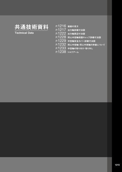 共通技術資料TechnicalDataP.1216P.1217P.1222P.1228P.1229P.1232P.1233P.1238銘板の見方出力軸詳細寸法図出力軸周辺寸法図同心中空軸保護キャップ詳細寸法図中空軸安全カバー詳細寸法図同心中空軸・同心中実軸の枠番について中空軸の取り付け・取り外しトルクアーム1215