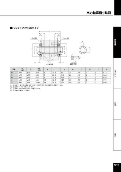 付録索引オプション技術資料■F3Sタイプ/VF3SタイプL1PGLL1PGフランジ面D2DD1フランジ面D2DD1WTC1止め輪用溝C130°F部詳細枠番D(H8)D1D2(h7)2025303545φ20φ25φ30φ35φ45φ29φ39φ44φ49φ64φ53φ66φ75φ85φ1006881014WTLL1PC1FG22.828.333.338.348.8961181241421682427333850131417202622222222221.151.351.351.751.95注1.出力軸キー溝寸法・公差は、JISB1301-1996平行キー用(普通形)に準拠しています。注2.出力軸のキー材は付属されていません。注3.止め輪は、JISB2804-2010に準拠しています。注4.止め輪は付属されていません。1219