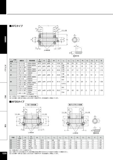 技術資料オプション索引付録■AFCタイプL1L3P1GL4P2Gフランジ面D1DDD1D2C1C2止め輪用溝WTF30°部詳細寸法枠番121518222832減速比相当容量1/3~1/101/3~1/101/10~1/301/3~1/101/10~1/601/3~1/51/7.5~1/101/10~1/601/3~1/51/7.5~1/101/10~1/601/15~1/301/3~1/51/7.5~1/101/10~1/301/40~1/60100W,200W200W,400W100W400W,750W100W,200W1000W750W200W,400W2000W1000W400W,750W0.75kW※3000W2000W1000W750W0.75kW※D(H8)φ12φ15D1φ19φ24D2(h7)φ50φ60φ18φ29φ70φ22φ34φ90W4566T13.817.320.824.8φ28φ44φ110831.3φ32φ49φ1201035.3注1.※印はバッテリー電源ギアモータの場合の値です。注2.出力軸キー溝寸法・公差は、JISB1301-1996平行キー用(普通形)に準拠しています。■AF3Sタイプフランジ面DD2D11分•3分仕様L1L3P1GL4P2Gフランジ面D1D2DC2C1止め輪用溝L191106102119113138126161137.5161154フランジ面D2DD1L3L4P1P2C1C2F2021232523252733891214141617203037162222222101013131322222G1.151.151.151.151.353543182721321.35低バックラッシ仕様L3P1GL2L3P1Gフランジ面DD2D1WFTC1C130°止め輪用溝部詳細枠番DD1D2WL2L3L42025303545(H8)φ20φ25φ30φ35φ45(h7)φ53φ66φ75φ85φ100注1.20枠は低バックラッシ仕様のみです。注2.15枠は1分・3分仕様のみです。他の枠番と形状が異なりますので、P.1092の寸法図にてご確認ください。注3.出力軸キー溝寸法・公差は、JISB1301-1996平行キー用(普通形)に準拠しています。φ29φ39φ44φ49φ64961181241421682427333850—334047636881014T22.828.333.338.348.8L1—1291351531831220P1P2C1C2F1314172026—2023263922222—1313131722222G1.151.351.351.751.95