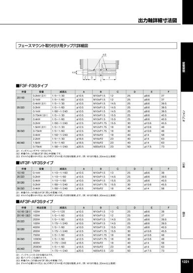 付録索引オプション技術資料フェースマウント取り付け用タップ穴詳細図4-ACD■F3F・F3Sタイプ枠番2018)2522)3028)3532)4540)容量0.2kW(注1)0.1kW0.4kW(注1)0.2kW0.1kW0.75kW(注1)0.4kW0.2kW1.5kW(注1)0.75kW0.4kW2.2kW1.5kW0.75kW減速比1/5~1/301/5~1/601/5~1/301/5~1/601/80~1/2401/5~1/301/5~1/601/80~1/2401/5~1/301/5~1/601/50~1/2401/5~1/301/5~1/601/80~1/240Aφ10.5φ10.5φ10.5φ10.5φ10.5φ10.5φ10.5φ12.5φ12.5φ12.5φ16.5φ16.5φ16.5φ20.54-BFEBM10xP1.5M10xP1.5M10xP1.5M10xP1.5M10xP1.5M10xP1.5M10xP1.5M12xP1.75M12xP1.75M12xP1.75M16xP2M16xP2M16xP2M20xP2.5121214.514.514.515.515.515.5181818232323CDEF2525252525252530303040404050φ8.6φ8.6φ8.6φ8.6φ8.6φ8.6φ8.6φ10.6φ10.6φ10.6φ14φ14φ14φ17.5373739.539.539.540.540.545.5484858636373注1.インダクションギアモータのみです。注2.枠番のカッコの値はF3F(同心中実軸)です。注3.ボルトの必要かかり代は、ねじの呼び(ボルト径)の2倍を推奨します。(例:M10の場合、20mm以上推奨)■VF3F・VF3Sタイプ枠番1518)2522)3028)3532)容量0.1kW0.2kW0.4kW0.2kW0.4kW減速比1/10~1/1601/10~1/601/10~1/601/80~1/2401/80~1/240Aφ10.5φ10.5φ10.5φ12.5φ16.5BM10xP1.5M10xP1.5M10xP1.5M12xP1.75M16xP21314.515.515.518CDEF2525253040φ8.6φ8.6φ8.6φ10.6φ143839.540.545.558注1.枠番のカッコの値はVF3F(同心中実軸)です。注2.ボルトの必要かかり代は、ねじの呼び(ボルト径)の2倍を推奨します。(例:M10の場合、20mm以上推奨)■AF3F・AF3Sタイプ枠番相当容量2522)1518)(注1)100W2018)(注2)100W200W100W400W200W750W1000W400W2000W750W4540)3028)3532)減速比10~1/1201/5~1/601/5~1/601/75~1/2401/5~1/601/75~1/2401/5~1/601/5~1/601/75~/2401/5~1/601/75~1/240Aφ10.5φ10.5φ10.5φ10.5φ10.5φ12.5φ12.5φ12.5φ16.5φ16.5φ20.5BM10xP1.5M10xP1.5M10xP1.5M10xP1.5M10xP1.5M12xP1.75M12xP1.75M12xP1.75M16xP2M16xP2M20xP2.5131214.514.515.515.51818182323CDEF2525252525303030404050φ8.6φ8.6φ8.6φ8.6φ8.6φ10.6φ10.6φ10.6φ14φ14φ17.5383739.539.540.545.54848586373注1.バックラッシ1分・3分仕様のみです。注2.低バックラッシ仕様のみです。注3.枠番のカッコの値はAF3F(同心中実軸)です。注4.ボルトの必要かかり代は、ねじの呼び(ボルト径)の2倍を推奨します。(例:M10の場合、20mm以上推奨)1221