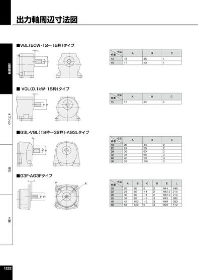 技術資料オプション索引付録出力軸周辺寸法図■VGL(50W・12~15枠)タイプCφAφB■VGL(0.1kW・15枠)タイプCφAφB■G3L・VGL(18枠~32枠)・AG3LタイプCφAφB■G3F・AG3FタイプCDφEφLφAφB寸法ABC1517354011寸法ABC17402寸法ABC2024303442534350606890105222333寸法A202430344253B50608088100120CDE0+1-1-2-20222333R14R12.5R12.5R15R19R20L198214214282350412枠番1215枠番15枠番182228324050枠番1822283240501222