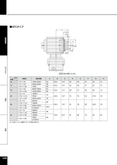 技術資料オプション索引付録■AFCタイプABC2φE(φG)φFφD10°(H)寸法枠番121518222832減速比相当容量ABCDEFGH部は空間になります。1/3~1/101/3~1/101/10~1/301/3~1/101/10~1/601/3~1/51/7.5~1/101/10~1/601/3~1/51/7.5~1/101/10~1/601/15~1/301/3~1/51/7.5~1/101/10~1/301/40~1/60100W,200W200W,400W100W400W,750W100W,200W1000W750W200W,400W2000W1000W400W,750W0.75kW※3000W2000W1000W750W0.75kW※545660616573768280.5869325.525.525.515.715.715.729.519.752525972505057703737405323232637.51414141829.519.781796246.51833.523.79189725522注.※印はバッテリー電源ギアモータの場合の値です。1230