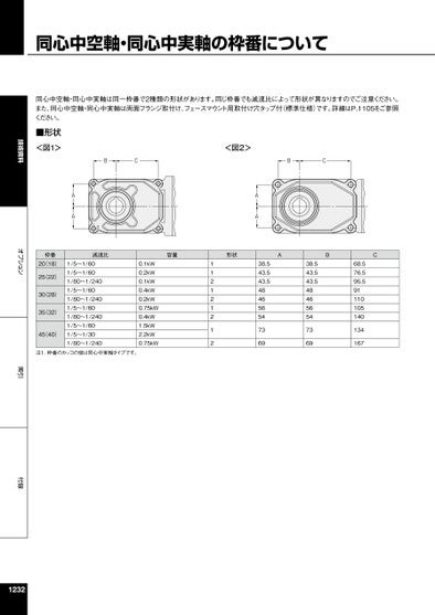 技術資料オプション索引付録同心中空軸・同心中実軸の枠番について同心中空軸・同心中実軸は同一枠番で2種類の形状があります。同じ枠番でも減速比によって形状が異なりますのでご注意ください。また、同心中空軸・同心中実軸は両面フランジ取付け、フェースマウント用取付け穴タップ付(標準仕様)です。詳細はP.1105をご参照ください。■形状<図1>枠番20(18)25(22)30(28)35(32)45(40)BCBC<図2>AAAA減速比容量形状ABC1/5~1/601/5~1/601/80~1/2401/5~1/601/80~1/2401/5~1/601/80~1/2401/5~1/601/5~1/301/80~1/2400.1kW0.2kW0.1kW0.4kW0.2kW0.75kW0.4kW1.5kW2.2kW0.75kW11212121238.543.543.548465654736938.543.543.548465654736968.576.595.591110105140134167注1.枠番のカッコの値は同心中実軸タイプです。1232