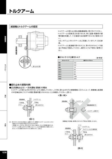 技術資料オプション索引付録・トルクアームの回り止め部は被動機械側に取り付けてください。トルクアームは回転反力を受けるため、特に起動・制動時の衝・撃荷重を考慮して、十分強度のある板厚やボルトをご使用ください。なお、オプションのトルクアームもご用意しています。P.1242参照。トルクアームと減速機の取り付けには、取り付けボルトにバネ座・金と平座金で固定してください。締付トルクは下表をご参照ください。●ボルトサイズと締付トルク(参考値)ボルトサイズ締付トルクN・mトルクアーム減速機とトルクアームの固定被動機械側回り止めⒶ部M5M6M8M10M12M14M16M202.94.913254469108294■回り止めⒶ部取付例●正逆運転および、一方向運転(断続)の場合トルクアームの回り止めをガタのないように固定してください。この時、回り止めの穴と被動機械に芯ズレによって、被動軸と減速機の中空軸全体にラジアル荷重(懸垂荷重)がかからないことを確認してください。[図-1]被動機械バネ座金ナットトルクアーム平座金回り止めボルト<悪い例>被動機械トルクアーム被動機械側の穴トルクアーム側の穴[図-1]注1.取り付けにガタがある場合は、起動のたびに衝撃がトルクアームにかかり、ボルトの緩みなどの不具合が発生するおそれがあります。ご事情により、ガタのない取り付けができない場合は、ボルトの保護対策のため、トルクアームと回り止めボルトの間にゴムブッシュなどの緩和剤をご使用ください。または、十分な強度のあるボルトをご使用ください。[図-2]被動軸と中空軸に無理な力がかかり不具合の原因になります。被動機械バネ座金ナットナットトルクアームゴムブッシュなどの緩和剤平座金回り止めボルト[図-2]1238