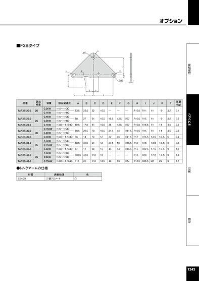 付録索引オプション技術資料■F3SタイプφKIGHFEBA品番該当枠番TAF3S-20-220TAF3S-25-2TAF3S-25-3TAF3S-30-2TAF3S-30-3TAF3S-35-2TAF3S-35-3TAF3S-45-2TAF3S-45-325303545容量該当減速比ABC0.2kW0.1kW0.4kW0.2kW0.1kW0.75kW0.4kW0.2kW1.5kW0.75kW0.4kW1.5kW2.2kW0.75kW1/5~1/301/5~1/601/5~1/301/5~1/601/80~1/2401/5~1/301/5~1/601/80~1/2401/5~1/301/5~1/601/80~1/2401/5~1/601/5~1/301/80~1/24053.523.56069.569.5782717.526.51480.531.5971152616170709494103.542.511820110110●トルクアームの仕様材質表面処理色SS400三価クロメート白10.510.510.51212151518.516.52621.53224.543―4948465654―69R41.5R12R16.513.513.5R46.5R12R1813.513.5R46.5R15R22.517.517.5―R15R2017.517.5R54R18.5R28.52222HCD3-φJTADEFGHIJKT質量(kg)10.5―――R10.5R111143.543.5R37R37R10.5R1511R10.5R16.511R41.5R10.5R15119911113.23.24.54.5669990.10.20.20.30.40.61.21.41.71243
