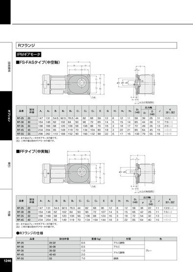 技術資料オプション索引付録RフランジIPMギアモータ■FS・FASタイプ(中空軸)A1B2C2B1C1B1C1C3B3A24-φJEGφD2φD1φDH3KH1H2(D2の有効深さ)品番RF-25RF-30RF-35RF-45RF-55該当枠番2530354555A1147164188234298A2B1B2B3C1C2C3EGH1H2H3D2(H8)出力軸D1D(H8)13114616820426254.562688511092.510212014918876.584100119152445056709082901081341686672881041325965708098121416182265336121518221711141721165865728510039444964792530354555J1111131518K注1、注213.5(―)7.5(―)2.5(―)――(―)(―)注1.K寸法はブレーキ付ギアモータの値です。注2.)内の値は防水ギアモータの値です。■FFタイプ(中実軸)A1B2C2B1C1φD2φDB1C1C3B3A24-φJA1A2B1B2B3C1C2C3EGH1H214716418823413114616820454.562688592.510212014976.584100119445056708290108134667288104951071241441214161865331215182258657285品番RF-25RF-30RF-35RF-45該当枠番22283240EGFKH1D2(H8)H2(D2の有効深さ)出力軸F36425464D(h6)22283240J11111315K注1、注213.5(―)7.5(―)――(―)(―)注1.K寸法はブレーキ付ギアモータの値です。注2.)内の値は防水ギアモータの値です。●Rフランジの仕様RF-25RF-30RF-35RF-45RF-551246品番該当枠番重量(kg)材質色25・2230・2835・3245・40550.50.51.02.07.0アルミ鋳物アルミアルミ鋳物鋳鉄グレー