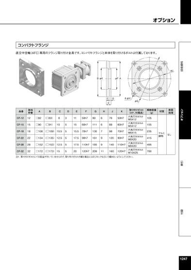 付録索引オプション技術資料コンパクトフランジ直交中空軸(AFC)専用のフランジ取り付け金具です。コンパクトフランジと本体を取り付けるボルトは付属しております。BφKφFAφJDCE4-φHφG品番CF-12CF-15CF-18CF-22CF-28CF-32該当枠番121518222832ABCDEFGHJK□82(□83)8□90(□91)10□108(□109)10.5□134(□135)12.5□152(□153)12.5□172(□173)15355555111550h79960h711115.570h713017.590h716117.5110h71856679976889850H760H770H712090H7140110H720120h720911160120H7取り付けボルト(4ケ、付属品)六角穴付ボルトM5X12六角穴付ボルトM5X12六角穴付ボルトM6X15六角穴付ボルトM8X20六角穴付ボルトM8X20六角穴付ボルトM10X25注1.取り付けボルトにバネ座金が付いていませんので、取り付けボルトが緩む場合にはネジロックなどにて緩まないようにしてください。概略質量(g)材質表面処理105155235415495780アルミ鋳物なし1247
