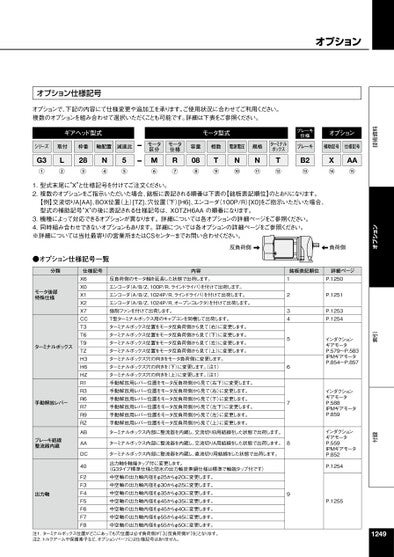 付録索引オプション技術資料ブレーキ仕様オプションブレーキ補助記号仕様記号B2⑬X⑭AA⑮ターミナルボックスT⑫ギアヘッド型式モータ型式シリーズ取付枠番軸配置減速比モータ区分モータ仕様容量相数電源電圧規格G3①L②28③N④5⑤M⑥R⑦08⑧T⑨N⑩N⑪1.型式末尾に”X”と仕様記号を付けてご注文ください。2.複数のオプションをご指示いただいた場合、銘板に表記される順番は下表の【銘板表記順位】のとおりになります。【例】交流切りA[AA]、BOX位置(上)[TZ]、穴位置(下)[H6]、エンコーダ(100P/R)[X0]をご指示いただいた場合、型式の補助記号"X"の後に表記される仕様記号は、XOTZH6AAの順番になります。3.機種によって対応できるオプションが異なります。詳細については各オプションの詳細ページをご参照ください。4.同時組み合わせできないオプションもあります。詳細については各オプションの詳細ページをご参照ください。※詳細については当社最寄りの営業所またはCSセンターまでお問い合わせください。●オプション仕様記号一覧分類仕様記号反負荷側負荷側内容銘板表記順位詳細ページオプションで、下記の内容にて仕様変更や追加工を承ります。ご使用状況に合わせてご利用ください。複数のオプションを組み合わせて選択いただくことも可能です。詳細は下表をご参照ください。オプション仕様記号モータ後部特殊仕様ターミナルボックス手動解放レバーブレーキ結線整流器内蔵出力軸X6X0X1X2X7CCT3T6T9TZH3H6HZR1R3R6R7R9RZABAADC40F2F3F4F5F6F7F8反負荷側のモータ軸を延長した状態で出荷します。エンコーダ(A/B/Z、100P/R、ラインドライバ)を付けて出荷します。エンコーダ(A/B/Z、1024P/R、ラインドライバ)を付けて出荷します。エンコーダ(A/B/Z、1024P/R、オープンコレクタ)を付けて出荷します。強制ファンを付けて出荷します。T型ターミナルボックス用のキャプコンを同梱して出荷します。ターミナルボックス位置をモータ反負荷側から見て(右)に変更します。ターミナルボックス位置をモータ反負荷側から見て(下)に変更します。ターミナルボックス位置をモータ反負荷側から見て(左)に変更します。ターミナルボックス位置をモータ反負荷側から見て(上)に変更します。ターミナルボックス穴の向きをモータ負荷側に変更します。ターミナルボックス穴の向きを(下)に変更します。注1)ターミナルボックス穴の向きを(上)に変更します。注1)手動解放用レバー位置をモータ反負荷側から見て(右下)に変更します。手動解放用レバー位置をモータ反負荷側から見て(右)に変更します。手動解放用レバー位置をモータ反負荷側から見て(下)に変更します。手動解放用レバー位置をモータ反負荷側から見て(左下)に変更します。手動解放用レバー位置をモータ反負荷側から見て(左)に変更します。手動解放用レバー位置をモータ反負荷側から見て(上)に変更します。1234567ターミナルボックス内部に整流器を内蔵し、交流切りB用結線をした状態で出荷します。ターミナルボックス内部に整流器を内蔵し、交流切りA用結線をした状態で出荷します。8ターミナルボックス内部に整流器を内蔵し、直流切り用結線をした状態で出荷します。出力軸を軸端タップ付に変更します。(G3タイプ標準仕様と防水の出力軸炭素鋼仕様は標準で軸端タップ付です)P.1250P.1251P.1253P.1254インダクションギアモータP.579~P.583IPMギアモータP.854~P.857インダクションギアモータP.588IPMギアモータP.859インダクションギアモータP.559IPMギアモータP.852P.1254中空軸の出力軸内径をφ25からφ20に変更します。中空軸の出力軸内径をφ30からφ25に変更します。中空軸の出力軸内径をφ35からφ30に変更します。中空軸の出力軸内径をφ45からφ35に変更します。中空軸の出力軸内径をφ45からφ40に変更します。中空軸の出力軸内径をφ55からφ45に変更します。中空軸の出力軸内径をφ55からφ50に変更します。9P.1255注1.ターミナルボックス位置がどこにあっても穴位置は必ず負荷側が「3」反負荷側が「9」となります。注2.トルクアームや保護素子など、オプションパーツには仕様記号はありません。1249
