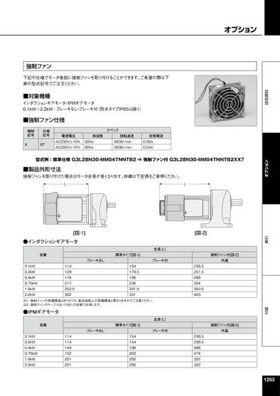 付録索引オプション技術資料強制ファン下記の仕様でモータ後部に強制ファンを取り付けることができます。ご希望の際は下表の型式記号でご注文ください。■対象機種インダクションギアモータ/IPMギアモータ0.1kW~2.2kW:ブレーキなし・ブレーキ付(防水タイプIP65は除く)■強制ファン仕様補助記号仕様記号XX7スペック電源電圧周波数回転速度定格電流AC200V±10%AC200V±10%50Hz60Hz2600r/min3000r/min0.05A0.04A型式例:標準仕様G3L28N30-MM04TNNTB2⇒強制ファン付G3L28N30-MM04TNNTB2XX7■製品外形寸法強制ファンを取り付けた場合はモータ全長が長くなります。詳細は下記表をご参照ください。LL[図-1]●インダクションギアモータ容量標準タイプ[図-1]ブレーキなし全長(L)ブレーキ付0.1kW0.2kW0.4kW0.75kW1.5kW2.2kW114129176217252.5302154179.5196236281.5331注1.強制ファンの保護構造はIP10です。製品銘板上の保護構造と異なりますのでご注意ください。注2.強制ファンのケーブルはバラ出しの状態で出荷します。●IPMギアモータ容量標準タイプ[図-1]ブレーキなし全長(L)ブレーキ付0.1kW0.2kW0.4kW0.75kW1.5kW2.2kW114114145152221221154154196203250250強制ファン付[図-2]共通強制ファン付[図-2]共通[図-2]236.5251.5268304353.5403236.5236.52682743223221253