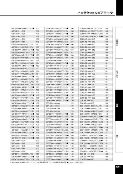 付録索引オプション技術資料インダクションギアモータG3F28S***-WM04T◇◇EV◆G3F-32-***-010G3F-32-***-020G3F-32-***-040G3F-32-***-075G3F-32-***-150G3F32N***-ER08T◇JTNG3F32N***-EM04T◇JTNG3F32N***-MR08T◇◇TB◆G3F32N***-MR08T◇◇TNG3F32N***-MR15T◇◇TB◆G3F32N***-MR15T◇◇TNG3F32N***-MM01C◇JAB2G3F32N***-MM01C◇JANG3F32N***-MM01T◇◇TB◆G3F32N***-MM01T◇◇TNG3F32N***-MM02C◇JAB2G3F32N***-MM02C◇JANG3F32N***-MM02T◇◇TB◆G3F32N***-MM02T◇◇TNG3F32N***-MM04C◇JAB2G3F32N***-MM04C◇JANG3F32N***-MM04T◇◇TB◆G3F32N***-MM04T◇◇TNG3F32N***-WR08T◇◇ENG3F32N***-WR08T◇◇EV◆G3F32N***-WR15T◇◇ENG3F32N***-WM01T◇◇ENG3F32N***-WM01T◇◇EV◆G3F32N***-WM02T◇◇ENG3F32N***-WM02T◇◇EV◆G3F32N***-WM04T◇◇ENG3F32N***-WM04T◇◇EV◆G3F32S***-WR08T◇◇ENG3F32S***-WR08T◇◇EV◆G3F32S***-WR15T◇◇ENG3F32S***-WM01T◇◇ENG3F32S***-WM01T◇◇EV◆G3F32S***-WM02T◇◇ENG3F32S***-WM02T◇◇EV◆G3F32S***-WM04T◇◇ENG3F32S***-WM04T◇◇EV◆G3F-40-***-020G3F-40-***-040G3F-40-***-075G3F-40-***-150G3F-40-***-220G3F40N***-ER08T◇JTNG3F40N***-MR08T◇◇TB◆G3F40N***-MR08T◇◇TN137178178178178178153153103103103103104104103103104104103103104104103103138138138138138138138138138138138138138138138138138138179179179179179153106106G3F40N***-MR15T◇◇TB◆G3F40N***-MR15T◇◇TNG3F40N***-MR22T◇◇TB◆G3F40N***-MR22T◇◇TNG3F40N***-MM02C◇JAB2G3F40N***-MM02C◇JANG3F40N***-MM02T◇◇TB◆G3F40N***-MM02T◇◇TNG3F40N***-MM04C◇JAB2G3F40N***-MM04C◇JANG3F40N***-MM04T◇◇TB◆G3F40N***-MM04T◇◇TNG3F40N***-WR08T◇◇ENG3F40N***-WR08T◇◇EV◆G3F40N***-WR15T◇◇ENG3F40N***-WR22T◇◇ENG3F40N***-WM02T◇◇ENG3F40N***-WM02T◇◇EV◆G3F40N***-WM04T◇◇ENG3F40N***-WM04T◇◇EV◆G3F40S***-WR08T◇◇ENG3F40S***-WR08T◇◇EV◆G3F40S***-WR15T◇◇ENG3F40S***-WR22T◇◇ENG3F40S***-WM02T◇◇ENG3F40S***-WM02T◇◇EV◆G3F40S***-WM04T◇◇ENG3F40S***-WM04T◇◇EV◆G3F-50-***-040G3F-50-***-075G3F-50-***-150G3F-50-***-220G3F50N***-MR08T◇◇TB◆G3F50N***-MR08T◇◇TNG3F50N***-MR15T◇◇TB◆G3F50N***-MR15T◇◇TNG3F50N***-MR22T◇◇TB◆G3F50N***-MR22T◇◇TNG3F50N***-MM04C◇JAB2G3F50N***-MM04C◇JANG3F50N***-MM04T◇◇TB◆G3F50N***-MM04T◇◇TNG3F50N***-WR08T◇◇ENG3F50N***-WR08T◇◇EV◆G3F50N***-WR15T◇◇ENG3F50N***-WR22T◇◇ENG3F50N***-WM04T◇◇ENG3F50N***-WM04T◇◇EV◆G3F50S***-WR08T◇◇ENG3F50S***-WR08T◇◇EV◆106106106106107107106106107107106106139139139139139139139139139139139139139139139139179179179179108108108108108108109109108108140140140140140140140140G3F50S***-WR15T◇◇ENG3F50S***-WR22T◇◇ENG3F50S***-WM04T◇◇ENG3F50S***-WM04T◇◇EV◆G3FS-18-***-010G3FS-18-***-020G3FS-22-***-010G3FS-22-***-020G3FS-22-***-040G3FS-28-***-010G3FS-28-***-020G3FS-28-***-040G3FS-28-***-075G3FS-32-***-010G3FS-32-***-020G3FS-32-***-040G3FS-32-***-075G3FS-32-***-150G3FS-40-***-020G3FS-40-***-040G3FS-40-***-075G3FS-40-***-150G3FS-40-***-220G3FS-50-***-040G3FS-50-***-075G3FS-50-***-150G3FS-50-***-220G3K-18-***-010G3K-18-***-020G3K18N***-EM01T◇JTNG3K18N***-EM02T◇JTNG3K18N***-MM01C◇JAB2G3K18N***-MM01C◇JANG3K18N***-MM01T◇◇TB◆G3K18N***-MM01T◇◇TNG3K18N***-MM02C◇JAB2G3K18N***-MM02C◇JANG3K18N***-MM02T◇◇TB◆G3K18N***-MM02T◇◇TNG3K18N***-WM01T◇◇ENG3K18N***-WM01T◇◇EV◆G3K18N***-WM02T◇◇ENG3K18N***-WM02T◇◇EV◆G3K18S***-WM01T◇◇ENG3K18S***-WM01T◇◇EV◆G3K18S***-WM02T◇◇ENG3K18S***-WM02T◇◇EV◆G3K-22-***-010G3K-22-***-020G3K-22-***-040140140140140189189189189189190190190190191191191191191191191191191191192192192192180180154154110110109109110110109109141141141141141141141141180180180※型式の***には減速比が入ります。また、◇には電源電圧記号、◇◇には電源電圧・規格記号、◆にはブレーキ仕様が入ります。1261
