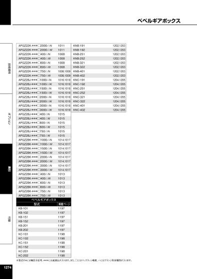 技術資料オプション索引付録ベベルギアボックスKNB-191KNB-192KNB-251KNB-252KNB-321KNB-322KNB-401KNB-402KNC-191KNC-192KNC-251KNC-252KNC-321KNC-322KNC-401KNC-4021202,12031202,12031202,12031202,12031202,12031202,12031202,12031202,12031204,12051204,12051204,12051204,12051204,12051204,12051204,12051204,1205APGZ22K-***□2000△NAPGZ22K-***□2000△WAPGZ22K-***□400△NAPGZ22K-***□400△WAPGZ22K-***□600△NAPGZ22K-***□600△WAPGZ22K-***□750△NAPGZ22K-***□750△WAPGZ28J-***□1000△NAPGZ28J-***□1000△WAPGZ28J-***□1500△NAPGZ28J-***□1500△WAPGZ28J-***□2000△NAPGZ28J-***□2000△WAPGZ28J-***□3000△NAPGZ28J-***□3000△WAPGZ28J-***□400△NAPGZ28J-***□400△WAPGZ28J-***□600△NAPGZ28J-***□600△WAPGZ28J-***□750△NAPGZ28J-***□750△WAPGZ28K-***□1000△NAPGZ28K-***□1000△WAPGZ28K-***□1500△NAPGZ28K-***□1500△WAPGZ28K-***□2000△NAPGZ28K-***□2000△WAPGZ28K-***□3000△NAPGZ28K-***□3000△WAPGZ28K-***□400△NAPGZ28K-***□400△WAPGZ28K-***□600△NAPGZ28K-***□600△WAPGZ28K-***□750△NAPGZ28K-***□750△Wベベルギアボックス型式KB-101KB-102KB-151KB-152KB-201KB-202KC-101KC-102KC-151KC-152KC-201KC-2021011101110081008100810081008,10091008,10091016,10181016,10181016,10181016,10181016,10181016,10181016,10181016,10181015101510151015101510151014,10171014,10171014,10171014,10171014,10171014,10171014,10171014,1017101310131013101310131013掲載ページ119711971197119711971197119811981198119811981198※型式の#には軸区分記号、***には減速比が入ります。また、□にはバックラッシ精度、△にはフランジ形状種別が入ります。1274