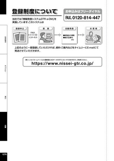 技術資料オプション索引付録登録制度について当社では「情報発信システムGTRe-DM」を実施しています。このシステムはお申込みはフリーダイヤルFAX.0120-814-447登録申込登録自動発信お客様FAXインターネット登録●新製品の情報●展示会案内etc上記のように一度登録していただければ、資料・ご案内などをタイムリーにE-mailにて発送させていただきます。(株)ニッセイホームページより最新版CADデータがダウンロードできますので、ご利用ください。https://www.nissei-gtr.co.jp/1276
