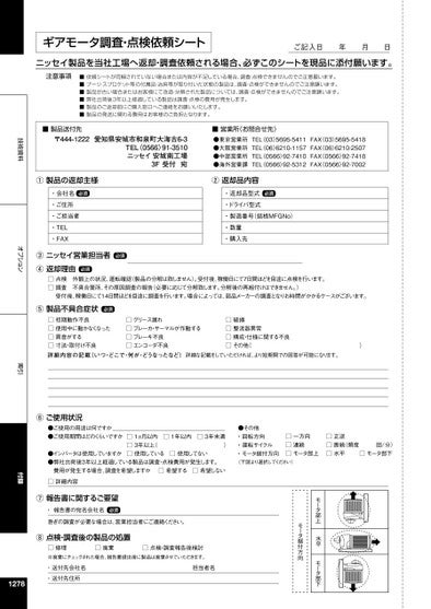 技術資料オプション索引付録ギアモータ調査・点検依頼シートご記入日年月日ニッセイ製品を当社工場へ返却・調査依頼される場合、必ずこのシートを現品に添付願います。注意事項■依頼シートが同梱されていない場合または内容が不足している場合、調査・点検できませんのでご注意願います。■プーリ・スプロケット等の付属品・冶具等が取り付いた状態の製品は、調査・点検ができませんのでご注意願います。■製品が古い場合またはお客様にて改造・分解された製品については、調査・点検ができませんのでご注意願います。■弊社出荷後3年以上経過している製品は調査・点検の費用が発生します。■製品のご返却前にご購入窓口へご連絡をお願いいたします。■製品の発送に関わる費用はお客様のご負担となります。■製品送付先〒444-1222愛知県安城市和泉町大海古6-3TEL〈0566〉91-3510ニッセイ安城南工場3F受付宛■営業所(お問合せ先)●東京営業所TEL03〉5695-5411FAX〈03〉5695-5418●大阪営業所TEL06〉6210-1157FAX〈06〉6210-2507●中部営業所TEL0566〉92-7410FAX〈0566〉92-7418●海外営業課TEL0566〉92-5312FAX〈0566〉92-7002①製品の返却主様・会社名必須・ご住所・ご担当者・TEL・FAX③ニッセイ営業担当者必須④返却理由必須②返却品内容・返却品型式必須・ドライバ型式・製造番号(銘板MFGNo)・数量・購入先□点検外観上の状況、運転確認(製品の分解は致しません)。受付後、稼働日にて7日間ほどを目途に点検を行います。□調査不具合箇所、その原因調査の報告(必要に応じて分解致します。分解後の再組付けはできません。)受付後、稼働日にて14日間ほどを目途に調査を行います。場合によっては、部品メーカーの調査となりお時間がかかるケースがございます。⑤製品不具合症状必須□初期動作不良□使用中に動かなくなった□異音がする□寸法・取付け不良詳細内容の記載(いつ・どこで・何が・どうなったなど)□グリース漏れ□ブレーカ・サーマルが作動する□ブレーキ不良□エンコーダ不良□破損□整流器異常□構成・仕様に関する不良□その他()詳細な記載をしていただければ、より短期間での回答が可能になります。⑥ご使用状況●ご使用の用途は何ですか●ご使用期間はどのくらいですか●インバータは使用していますか●弊社出荷後3年以上経過している製品は調査・点検費用が発生します。□1ヵ月以内□1年以内□3年未満□3年以上()□使用している□使用してない●その他・回転方向運転サイクル・・モータ据付方向(下図より選択してください)□一方向□連続□モータ部上□正逆□断続(頻度回/分)□水平□モータ部下モータ部上水平モータ部下モータ据付方向費用が発生する場合、調査を希望しますか□希望する□希望しない□詳細内容⑦報告書に関するご要望・報告書の宛名会社名必須急ぎの調査が必要な場合は、営業担当者にご連絡ください。⑧点検・調査後の製品の処置□修理□廃棄□点検・調査報告後検討※廃棄にチェックされた場合、報告書提出後に製品は廃棄させていただきます。・送付先会社名・送付先住所1278担当者名